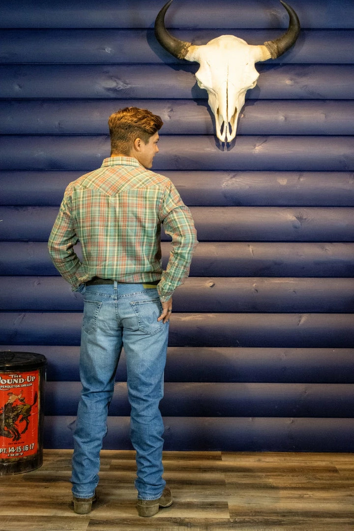 The Graduate Tailored Leg Jean for men features a lived in blue denim wash with placement fading and 3D whiskering, a slim mid rise waist, and a relaxed fit at the hip to the knee before tapering at the leg opening. ย This menโs slim straight jean is designed in a midweight denim blend with added stretch for a classic, structured feel with comfortable wear.