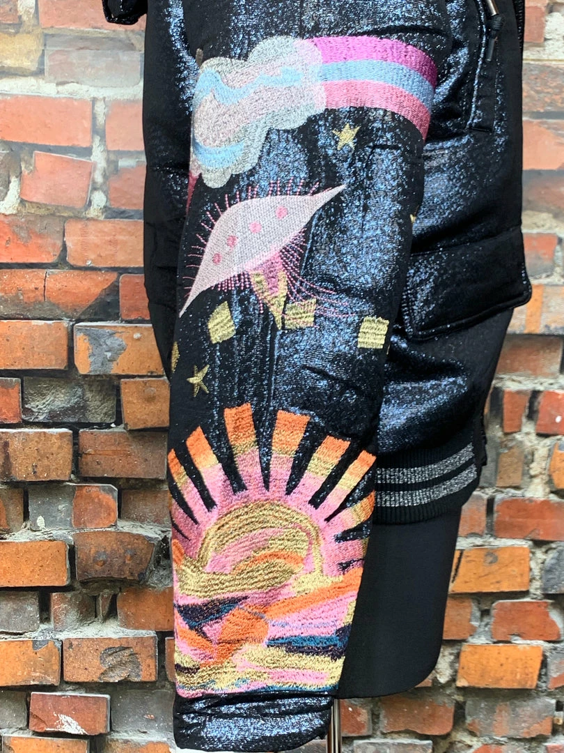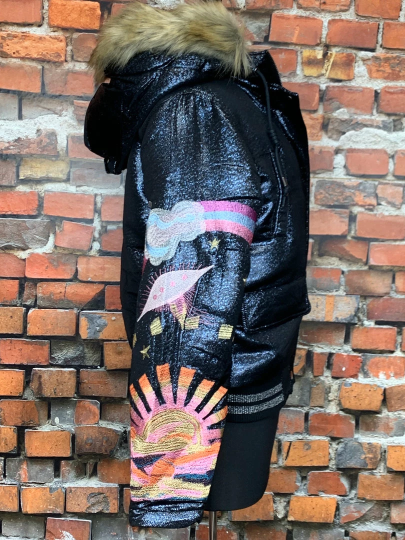 Designed in Spain by Custo Barcelona. ย Navy/black metallic with beautiful embroidery on sleeve. ย Hood with faux fur. ย The 36 fit me with a little extra room. ย In US sizing I wear a medium and or a 8/10