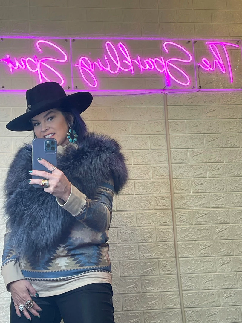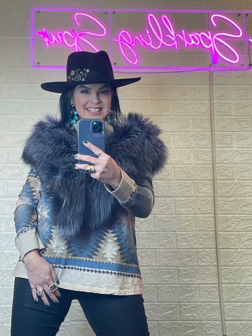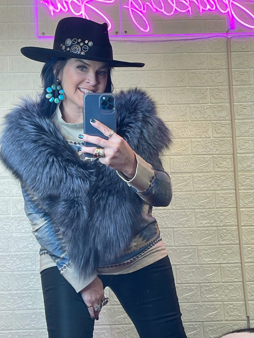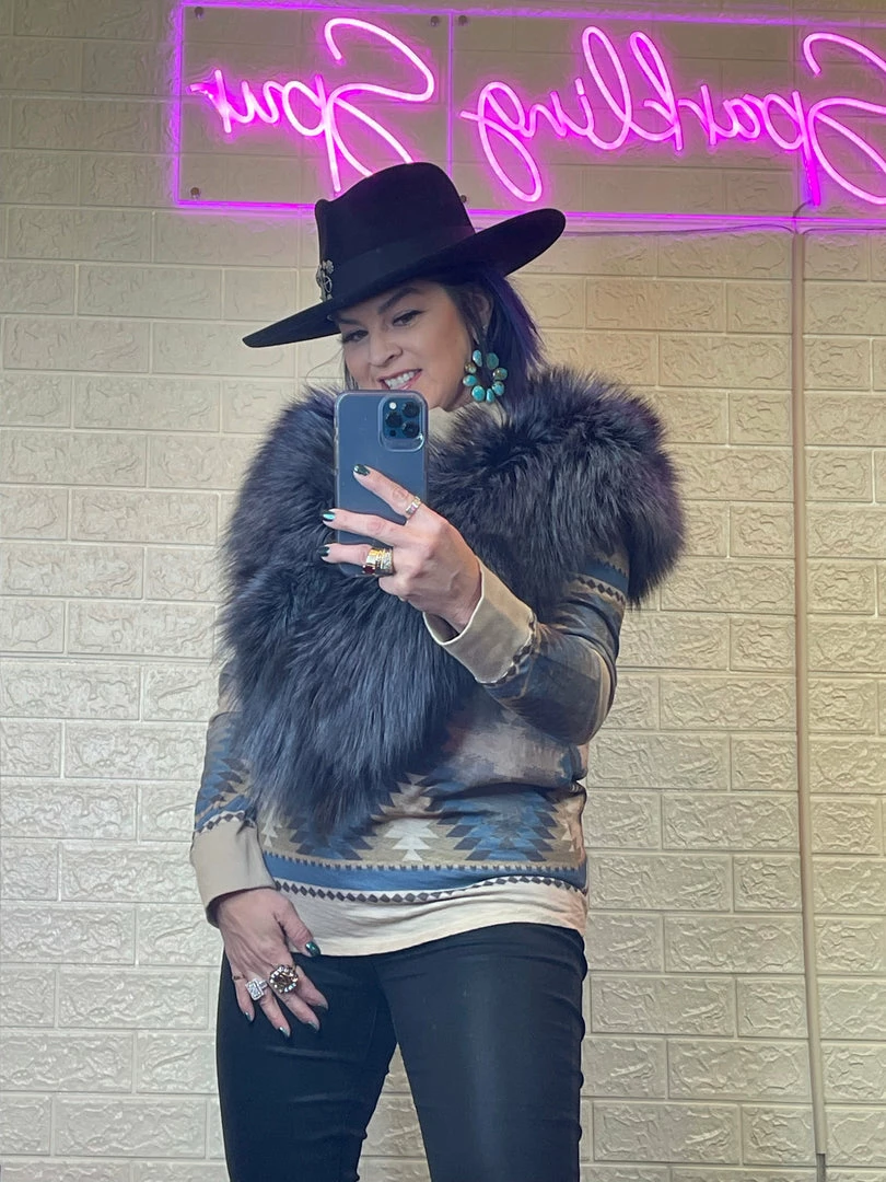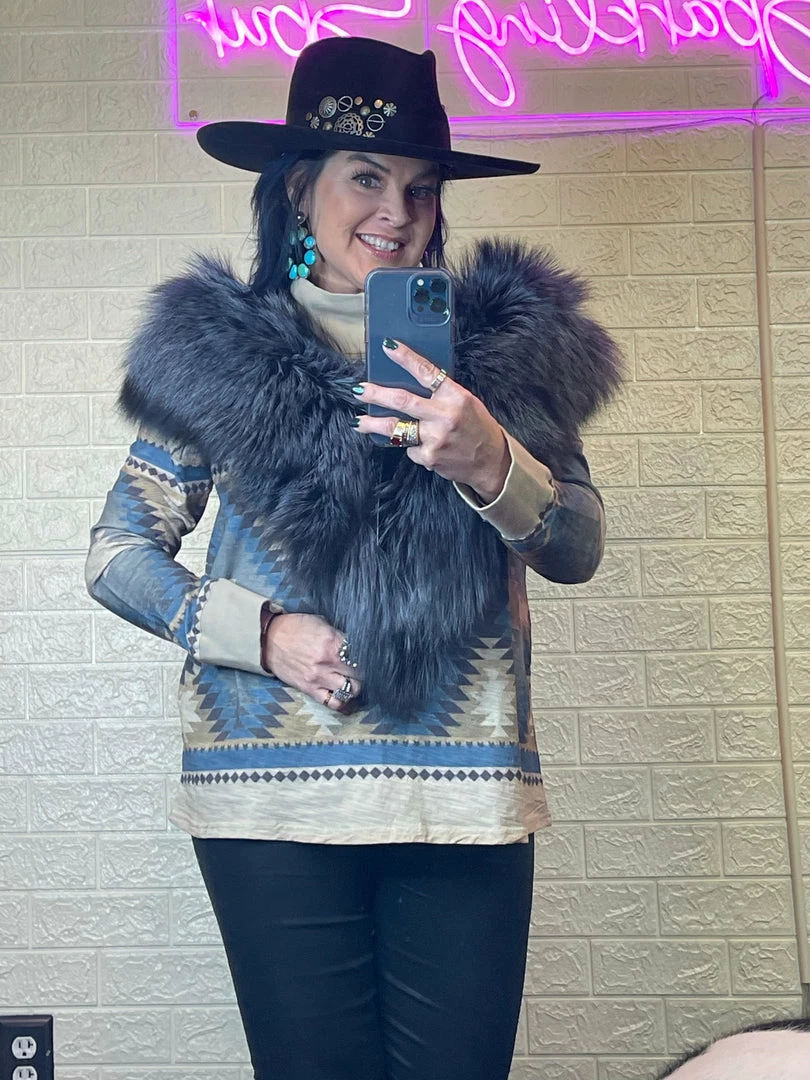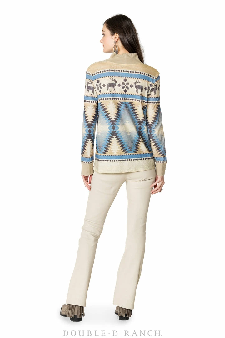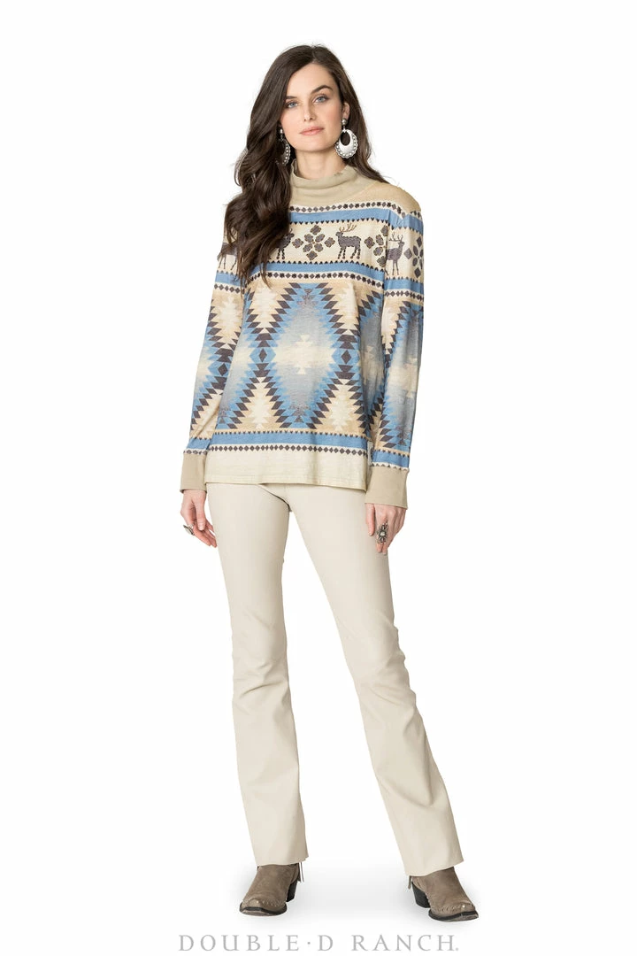 Thereโs a lot to love about this little number. Itโs a lightweight, long-sleeved cotton top that has statement sweater vibes with a bold geometric pattern and a band of deer designs. It has a relaxed fit with a mock-turtleneck and soft shades of warm browns and baby blues that are perfect for the season.