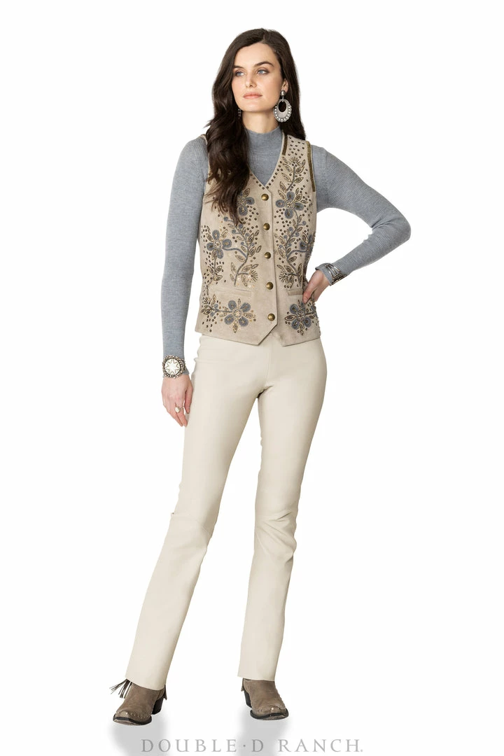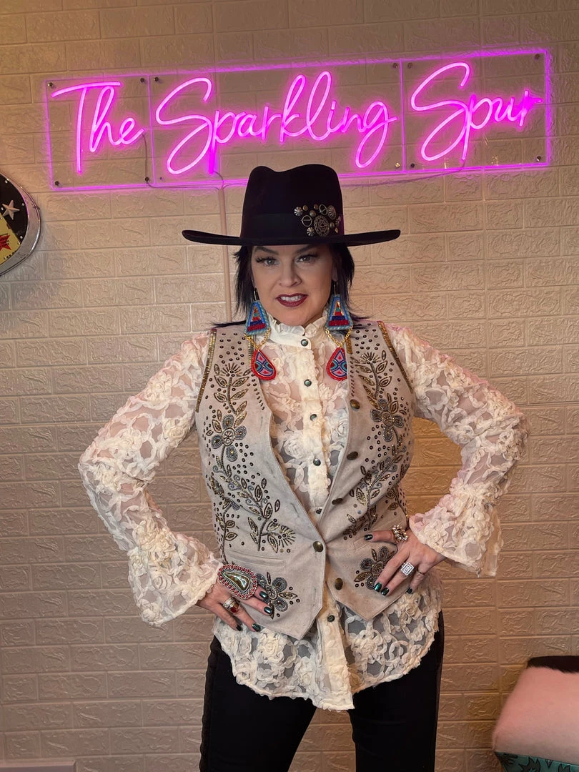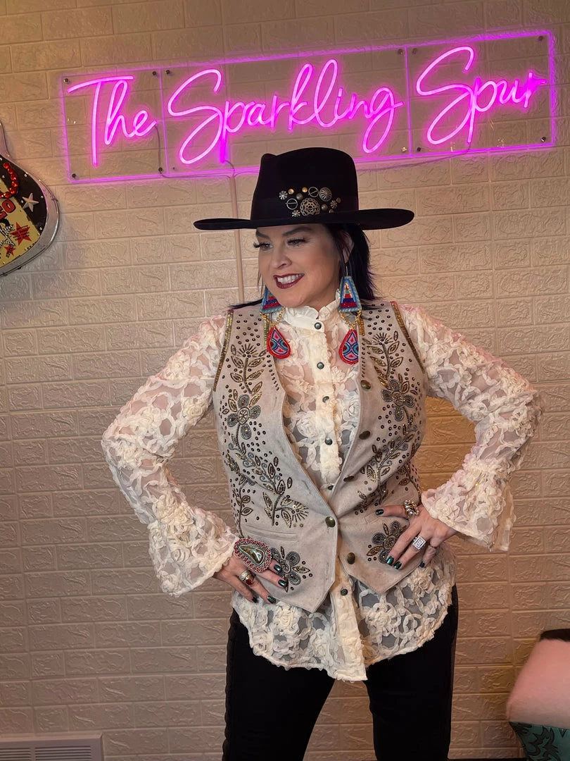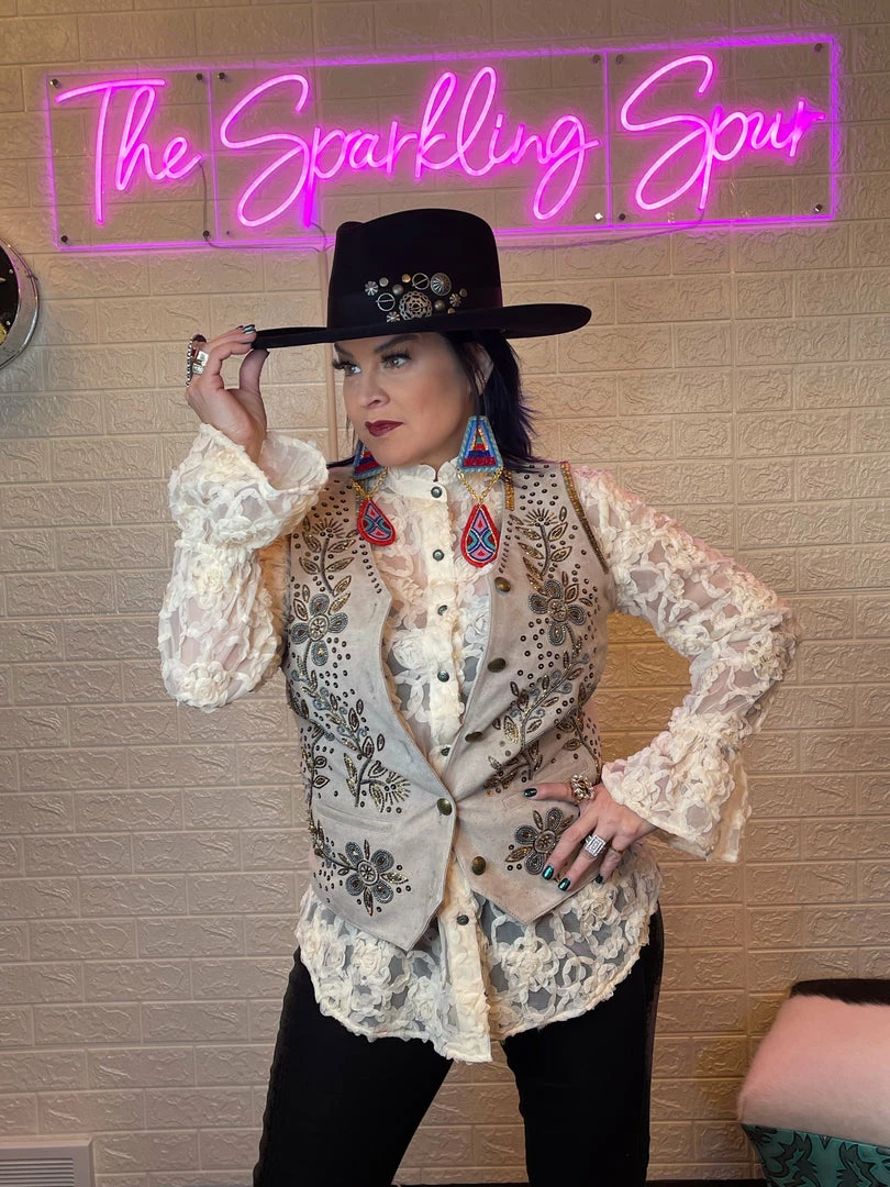 ย Nothing pulls an outfit together and makes you look perfectly polished like a statement vest, and this one is ready to rock your winter wardrobe. The soft suede is given a glitzy glow-up with sparkly floral beading and finished with sequins, studding, and custom concho buttons. A little bit of flash and a whole lot of fabulous!