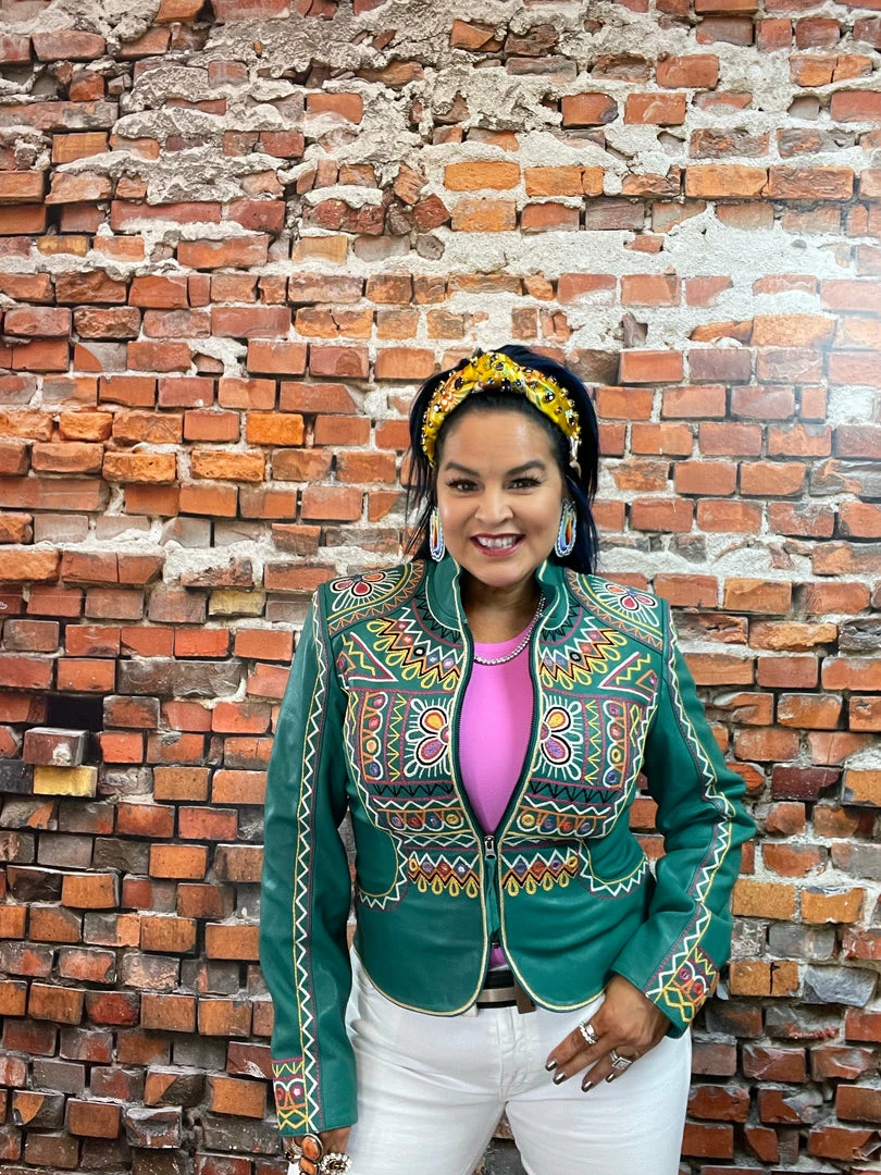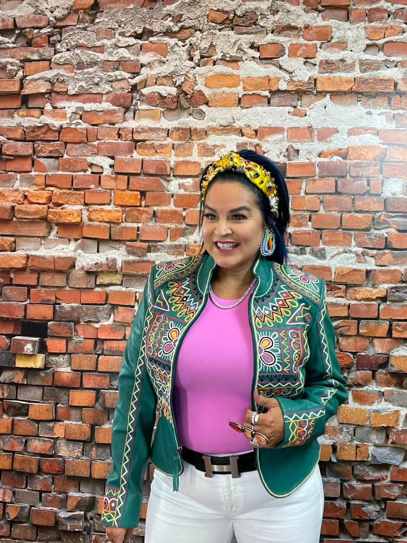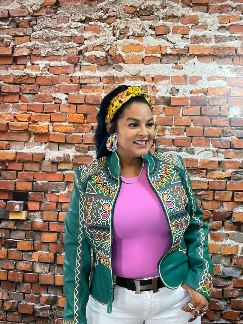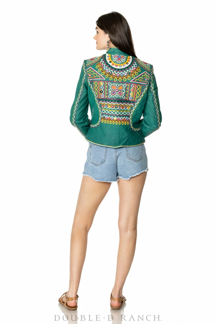 The โFestival of Colorsโ is an enormous and very vibrant annual celebration in India (thatโs actually taking place right about now-ish, March 18th) which involves the tossing, spreading, and smearing of vividly colorful powders, leaving festival-goers covered head-to-toe in lively hues. This jacket incorporates those bright colors as well as intricate geometric embroidery inspired by the folk art aesthetic from that part of the world. You canโt NOT feel joyous in this jacket โ itโs like wearing a party!