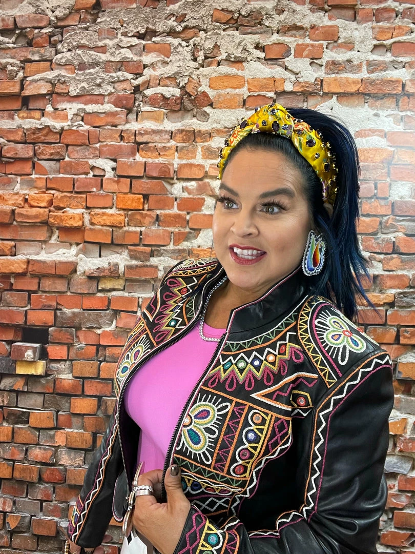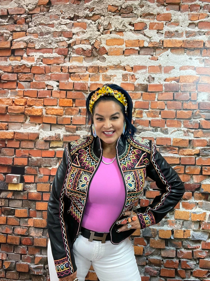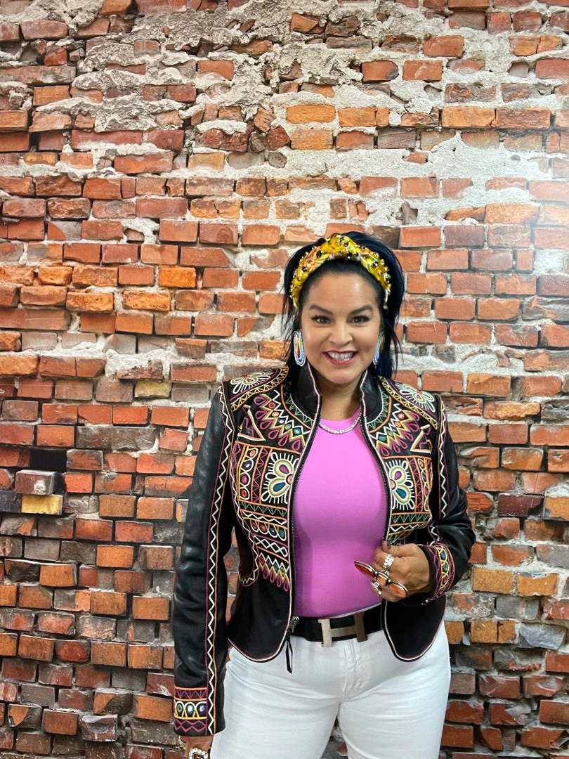 The βFestival of Colorsβ is an enormous and very vibrant annual celebration in India (thatβs actually taking place right about now-ish, March 18th) which involves the tossing, spreading, and smearing of vividly colorful powders, leaving festival-goers covered head-to-toe in lively hues. This jacket incorporates those bright colors as well as intricate geometric embroidery inspired by the folk art aesthetic from that part of the world. You canβt NOT feel joyous in this jacket β itβs like wearing a party!
