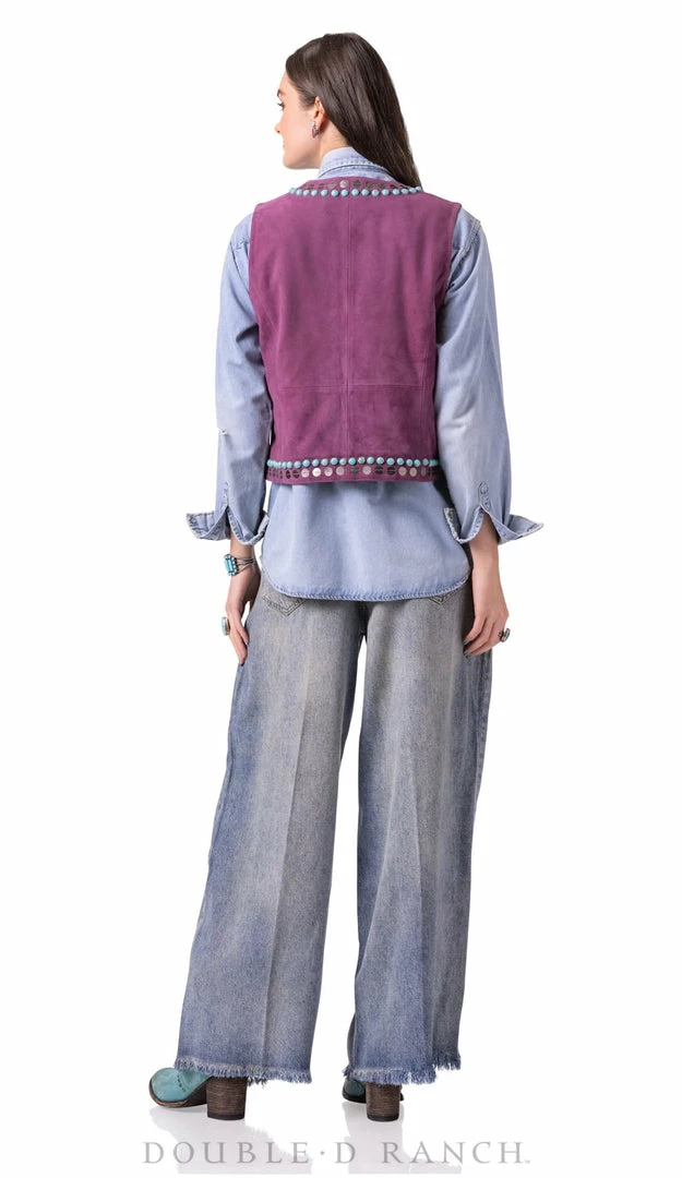 Β This gorgeous goat suede vest brings together lots of things we love: rich color, custom conchos, (faux) turquoise, and over-the-top embellishing! Itβs a classic zip-front silhouette and it comes in two lovely hues (good luck choosing!) so you can amp up almost any outfit with ease.