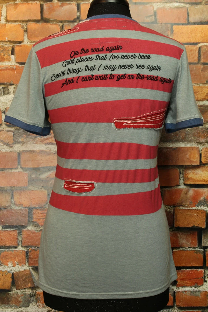 Β Itβs a classic old school silhouette with ringed collar and sleeve, and features a print graphic image reminiscent of the β70s-β80s era. The back also features asymmetrical stripes across it, so youβre making a statement coming and going!