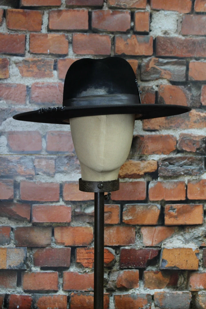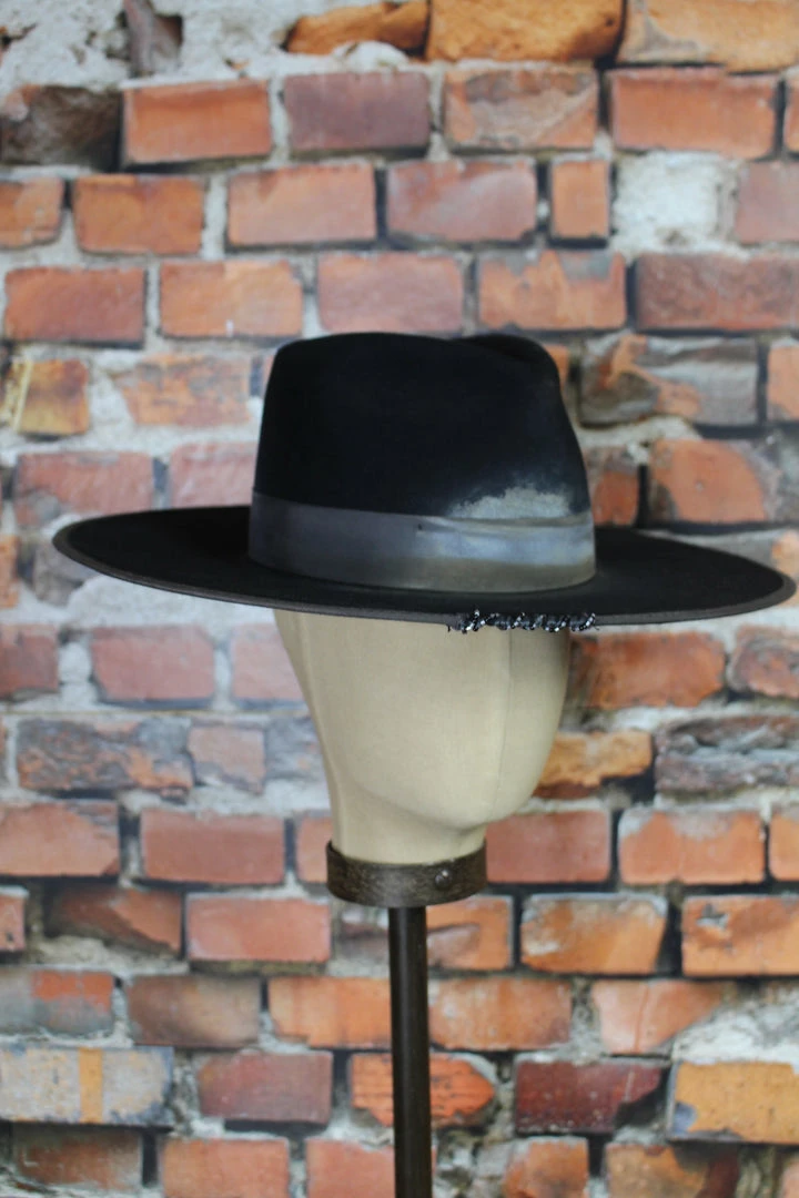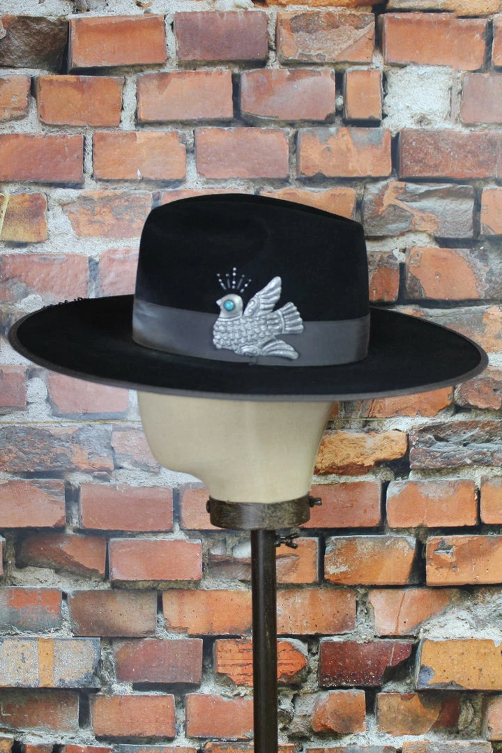 A cross between a menβs fedora and the classic cowboy hat, the large flat brim is the trendiest hat is womenβs wear right now. Featuring a pinched fedora crown, a broad 4-inch brim, grosgrain band, silver dove Milagro and light hand-beading.Β
