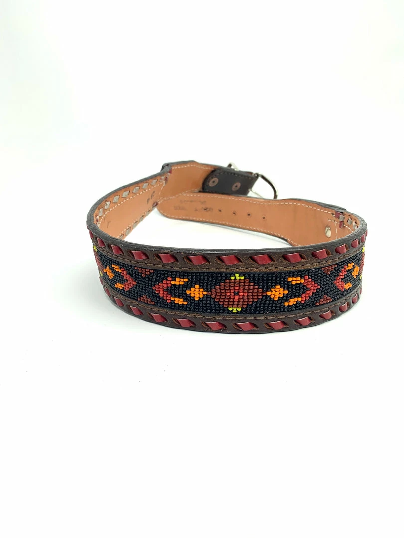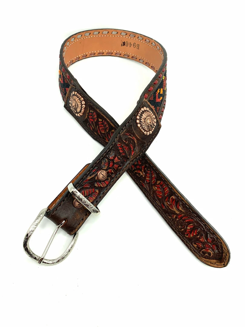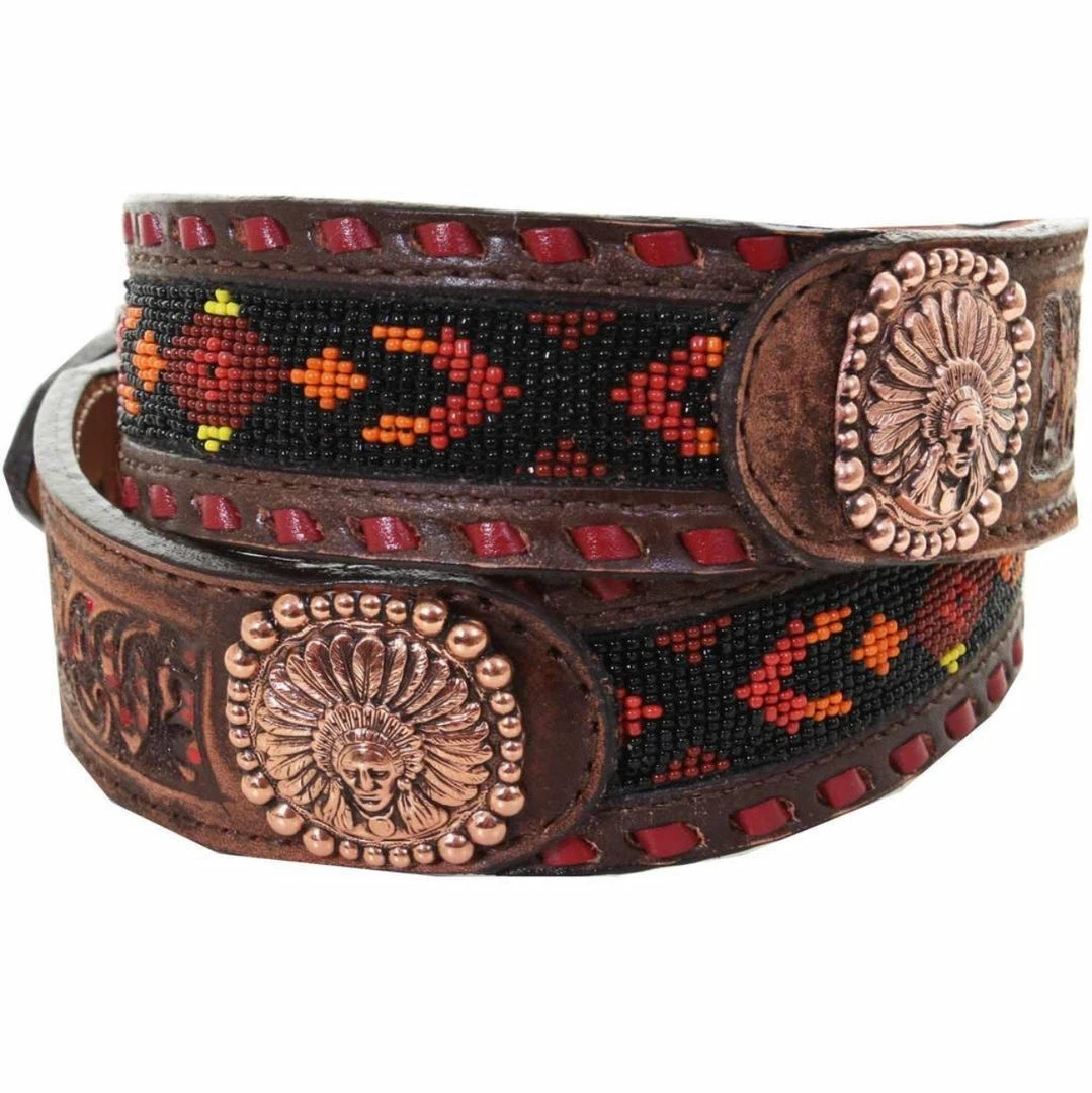 Vintage belt with floral tooled and highlighted ends. Sunset beaded inlay, red buck stitch and antique copper indian head conchos.