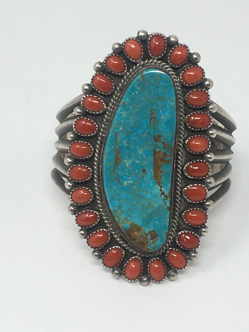 Turquoise stone surrounded by 24 Red Coral stones.