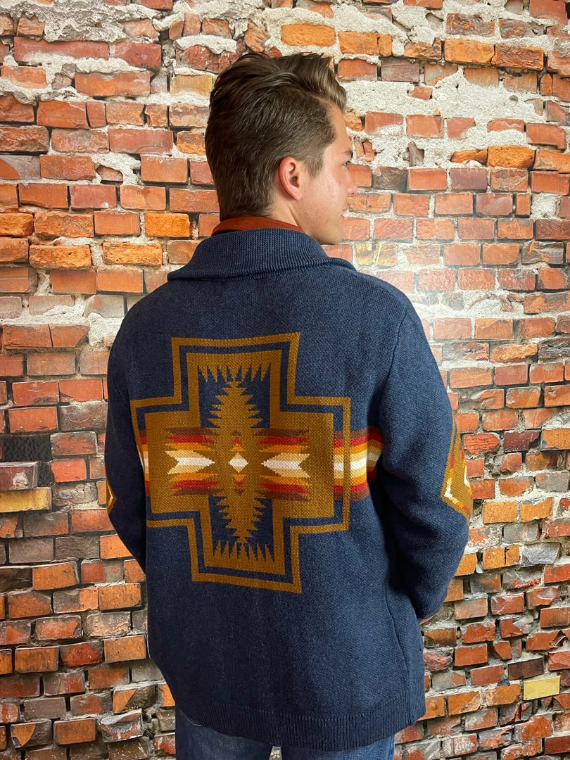 Men’s cardigan crafted of pure cotton in a mid-weight knit, for breathable comfort any time of year. Solid front with patterned sleeves; back features our historic 1923 Harding pattern. Three pockets; ribbed shawl collar, cuffs and hem.