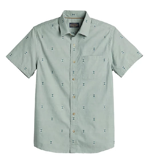 Dobby fabric with woven jacquard-inspired details as pictured.Β Spread collar, one matched chest pocket.
