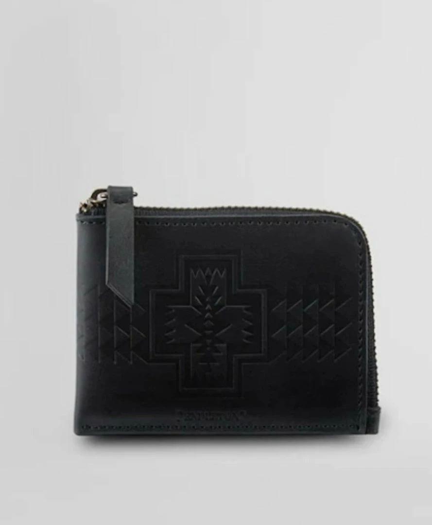 Zip-close wallet has an embossed pattern on front, with multiple card slots inside. Lined.