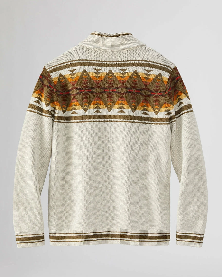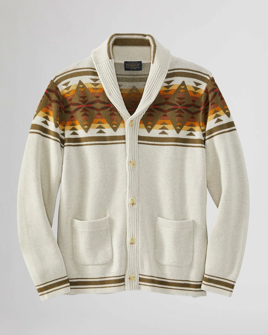 Button-front men’s cardigan knit of pure cotton, with a uniquely Pendleton pattern front and back. Two front pockets; ribbed shawl collar, cuffs and hem.