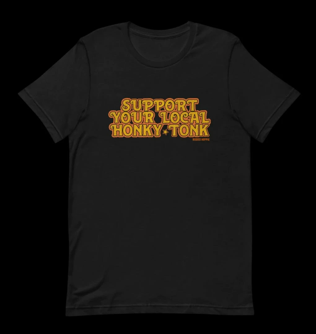SUPPORT YOUR LOCAL HONKY TONK is printed on a Bella + Canvas 3001 black unisex tee.Β