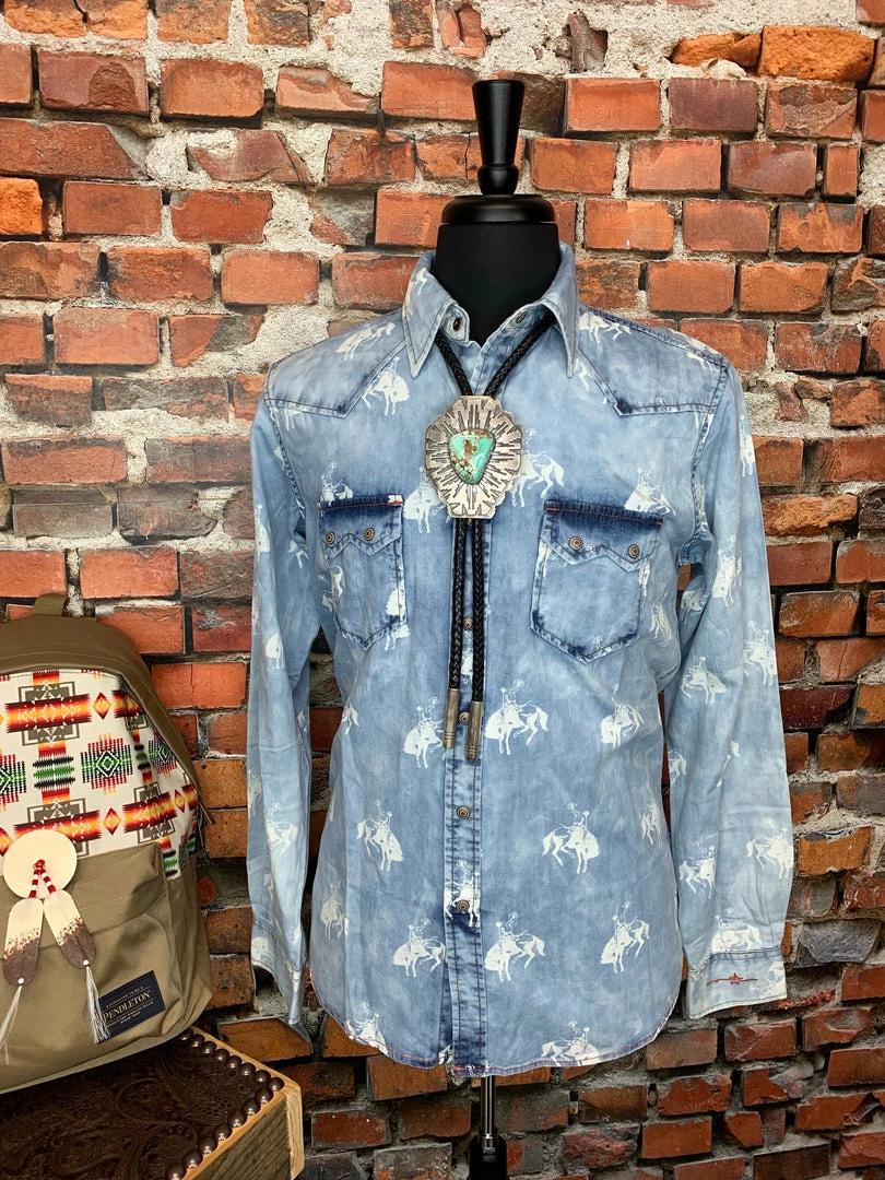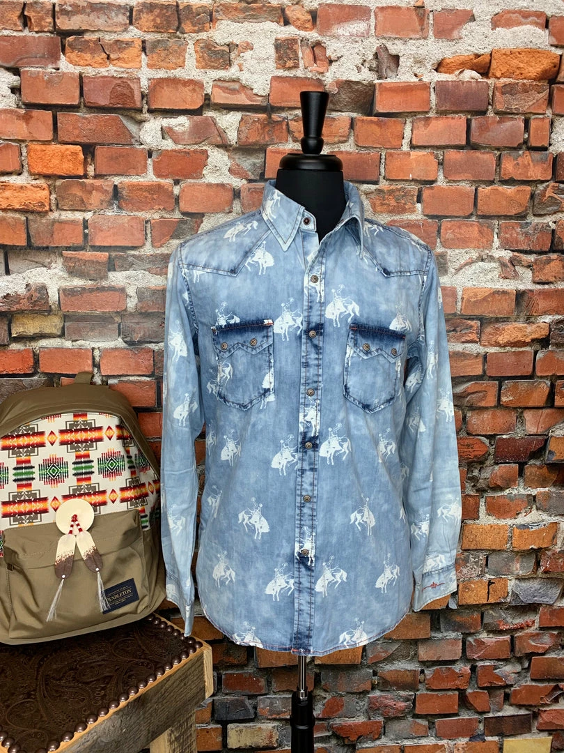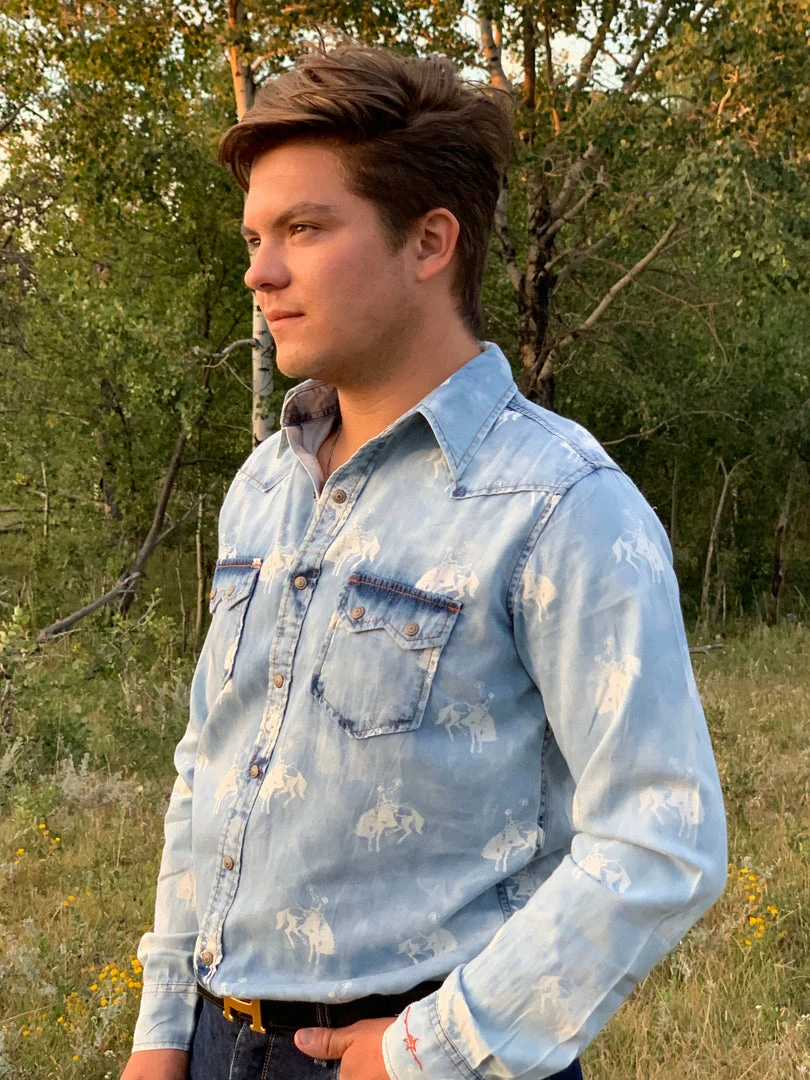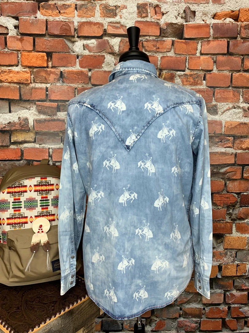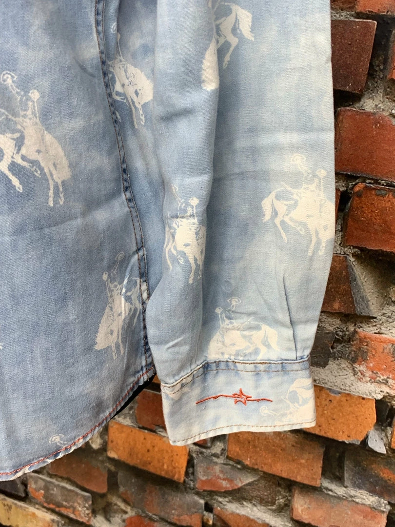 Ryan Michael indigo western snap shirt, with front and back yokes, features an iconic bucking horse print. Β Double snap cuffs, etched copper snaps and contrast stitching give this shirt a unique look.