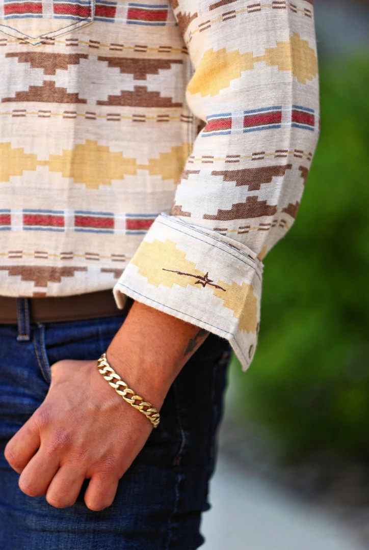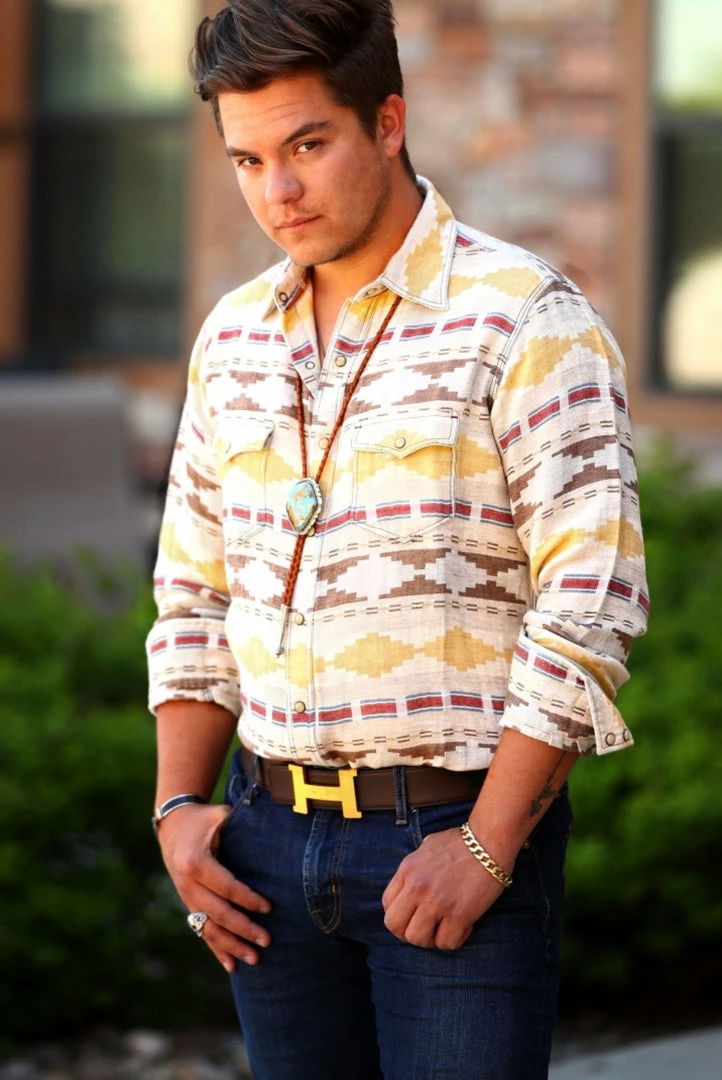 Brushed cotton, blanket jacquard shirt has a soft flannel feel to it making it perfect for cooler weather. ย Accented with contrast stitching and finished with horn snaps.
