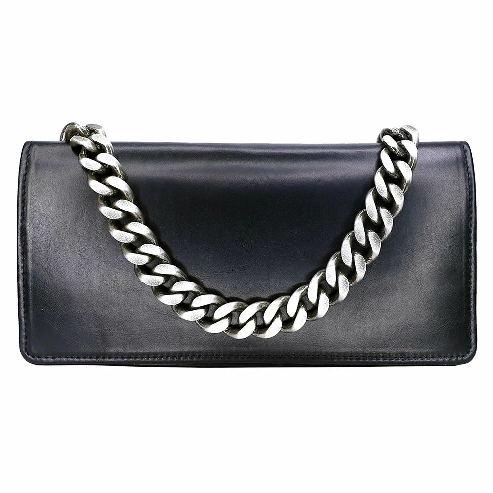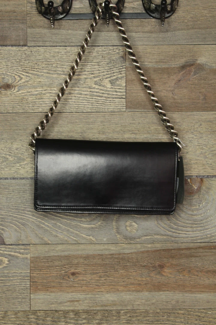 Super elegant smooth black Italian leather clutch with Antique silver chain shoulder strap.