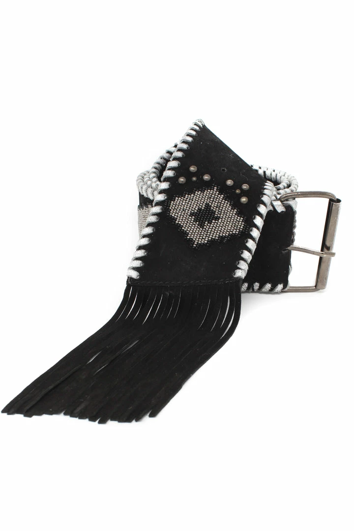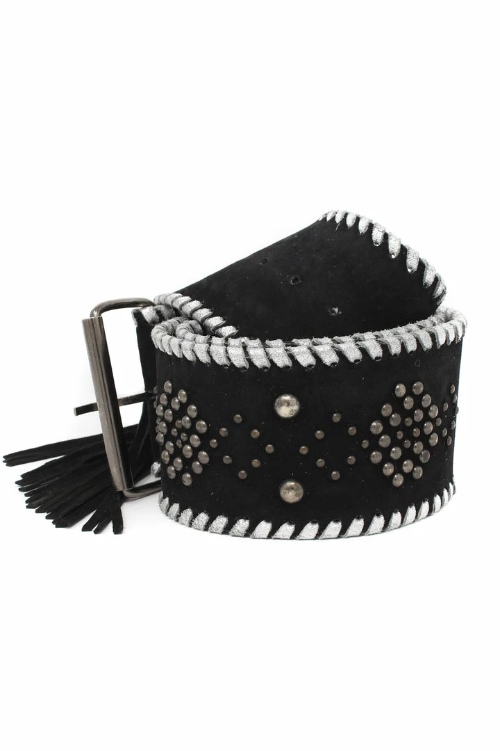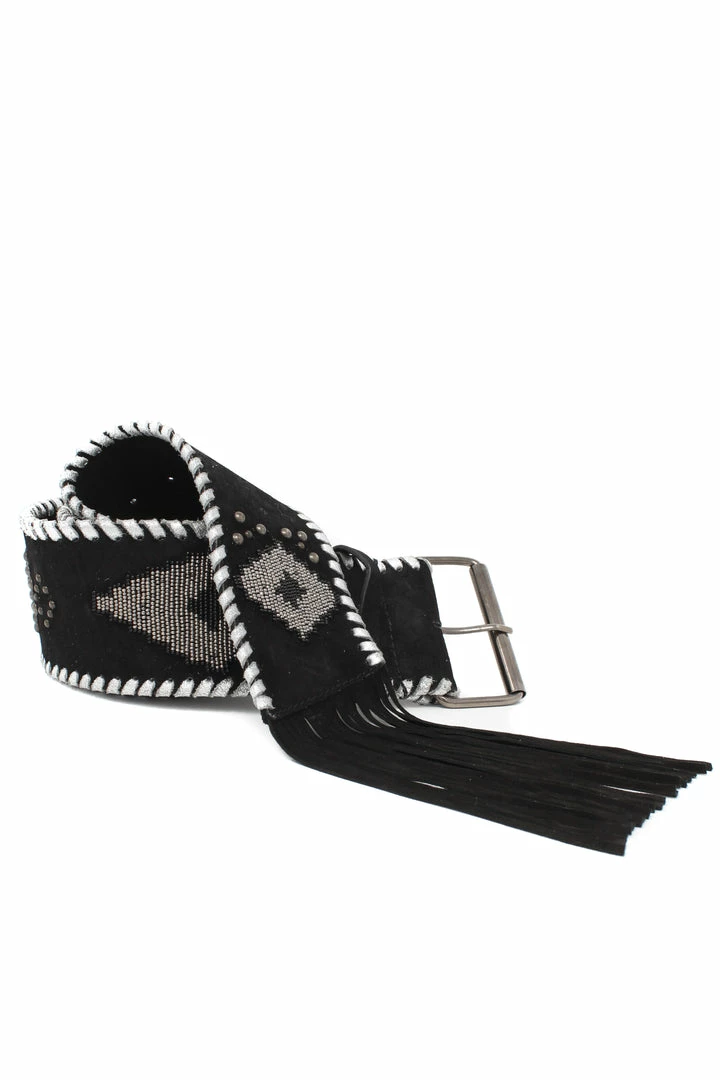Black leather belt with silver beads, studs, fringed end and silver stitching on the edges.