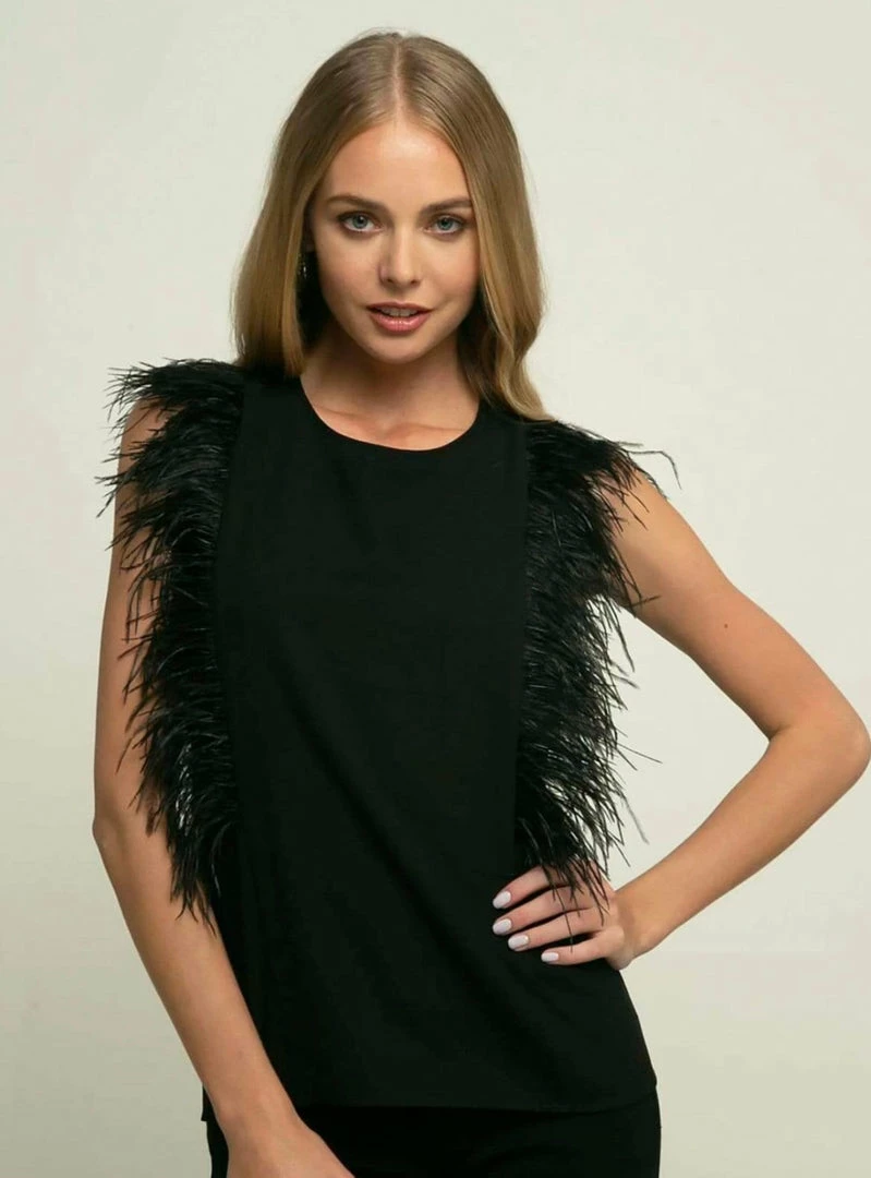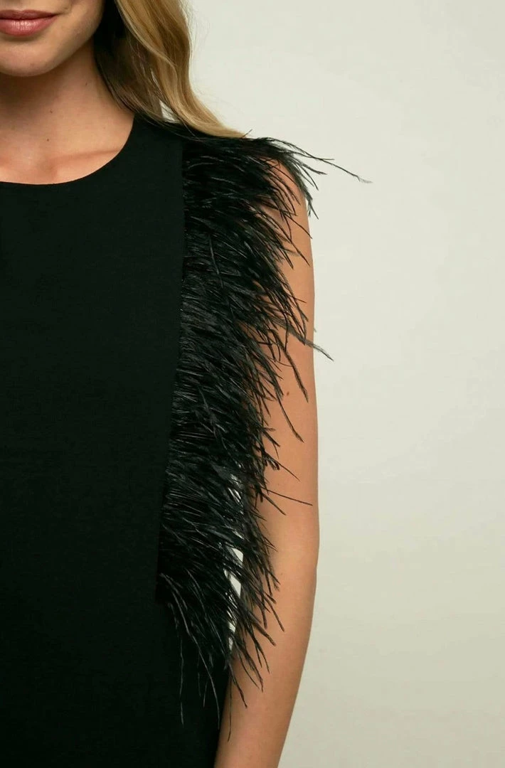 The season less black top you can wear forever. Lovely black crepe fabric with realย sustainable sourced ostrich feathers. Key hole back neckline.ย