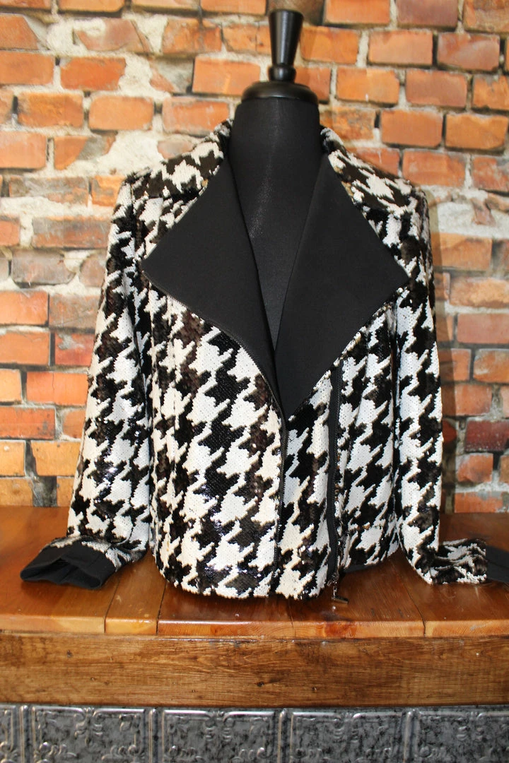 Black & Ivory sequins never looked so good together.ย The pattern and style of this jacket says “smart and sassy” all the way!ย ย