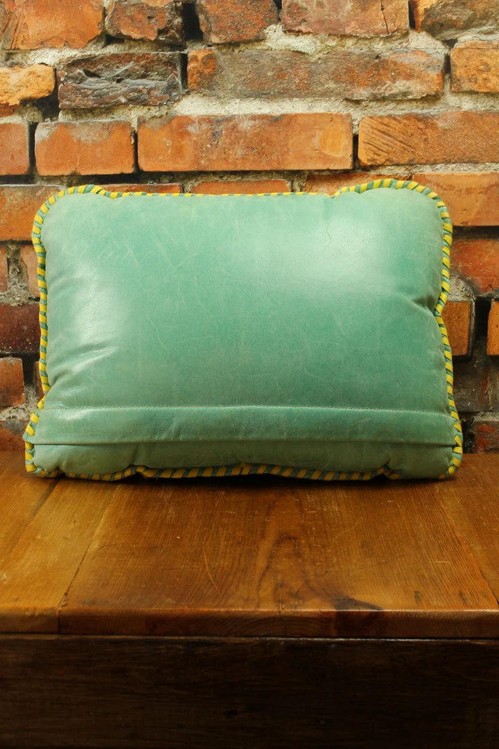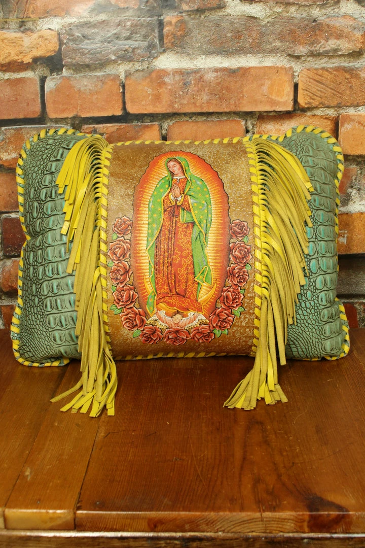 - Leather pillow with whip stitching around the edge and leather fringe bordering the Holy image.