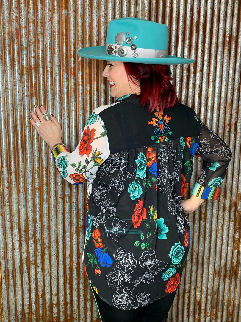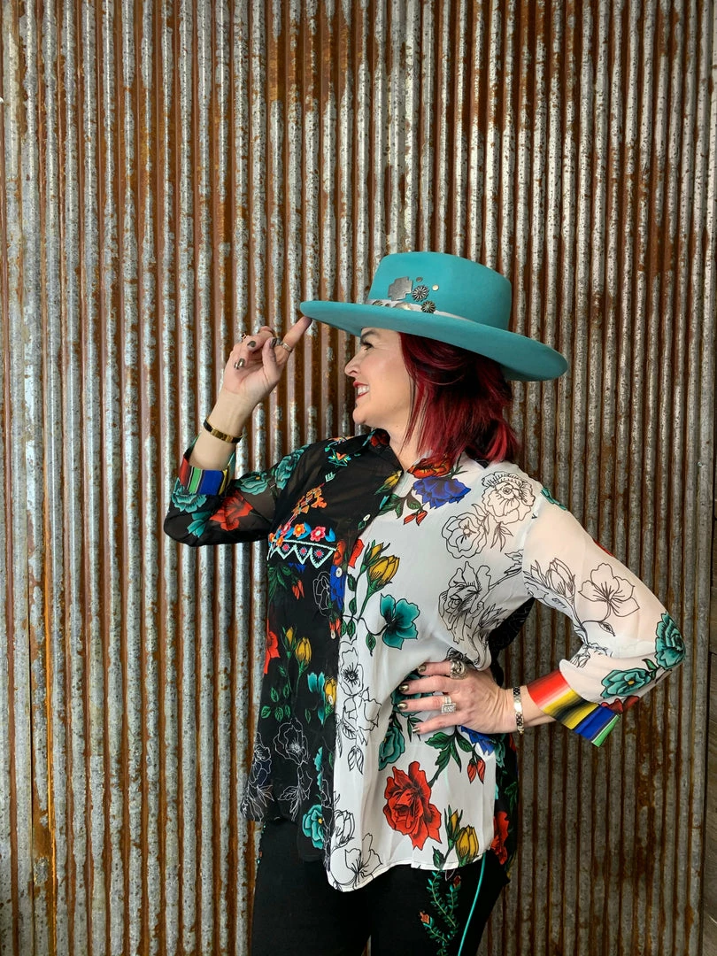 Beautiful sheer Chiffon top with button front closure.ย Black back and half black/half white front with contrasting flowers throughout.ย Embroidery, stripes and bold colors really make this a class act.